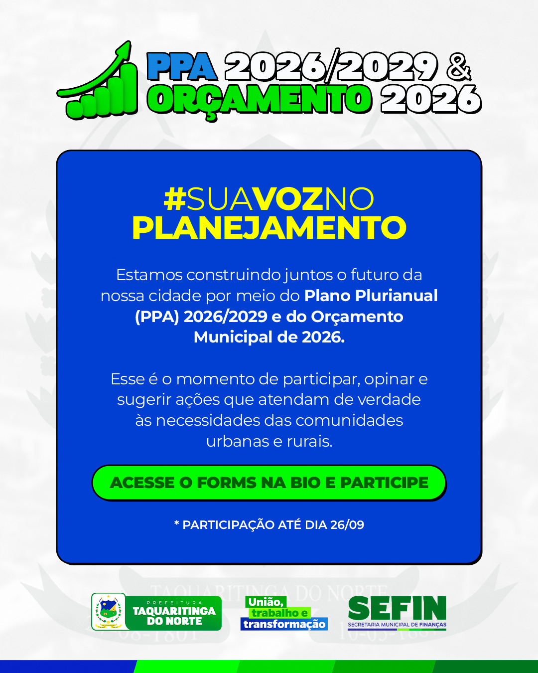 A Prefeitura de Taquaritinga do Norte, lança a campanha “Sua Voz no Planejamento” e convida toda a população a participar da elaboração do Plano Plurianual (PPA) 2026/2029 e do Orçamento Municipal de 2026. Esses instrumentos definirão as prioridades, programas e investimentos que irão moldar o desenvolvimento do município pelos próximos quatro anos, com foco em atender às necessidades das comunidades urbanas e rurais.[...]