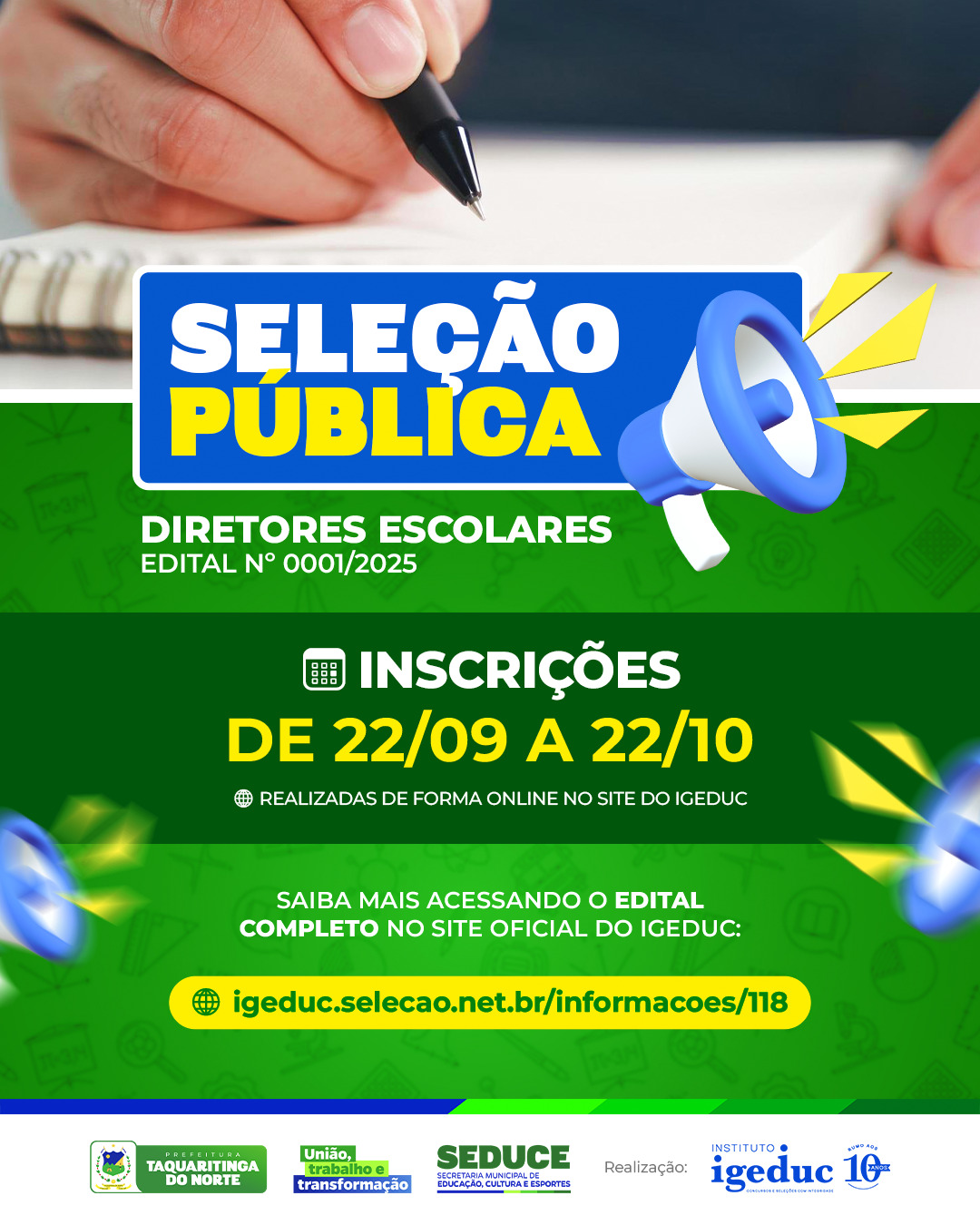 As inscrições estão abertas no período de 20/09 até 18/10 na Secretaria Municipal de Educação – Departamento de Inspeção, localizada na Rua Agamenon Magalhães Nº 14, Centro Taquaritinga do Norte-PE, no horário das 08h ás 13:00h.
