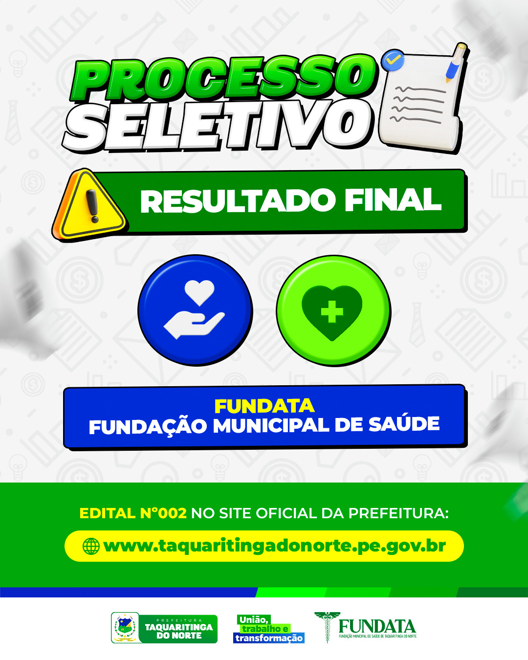 A Fundação Municipal de Saúde de Taquaritinga do Norte (FUNDATA) publicou nesta quarta-feira (17) o resultado final do Processo Seletivo Simplificado nº 002/2025, destinado à contratação temporária de profissionais para atuação em 2026.
