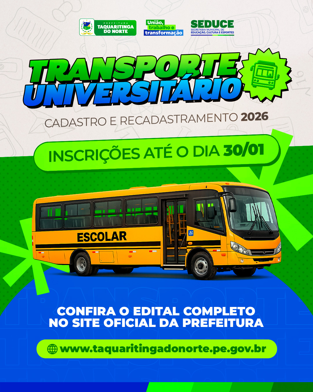 A Secretaria de Educação, Cultura e Esportes de Taquaritinga do Norte (SEDUCE), publicou o Edital nº 001/2026 que regulamenta o processo de concessão do transporte escolar universitário para estudantes de graduação e pós-graduação. O benefício é destinado a moradores do município regularmente matriculados em instituições de ensino superior localizadas em Caruaru (PE), Santa Cruz do Capibaribe (PE) e Campina Grande (PB).