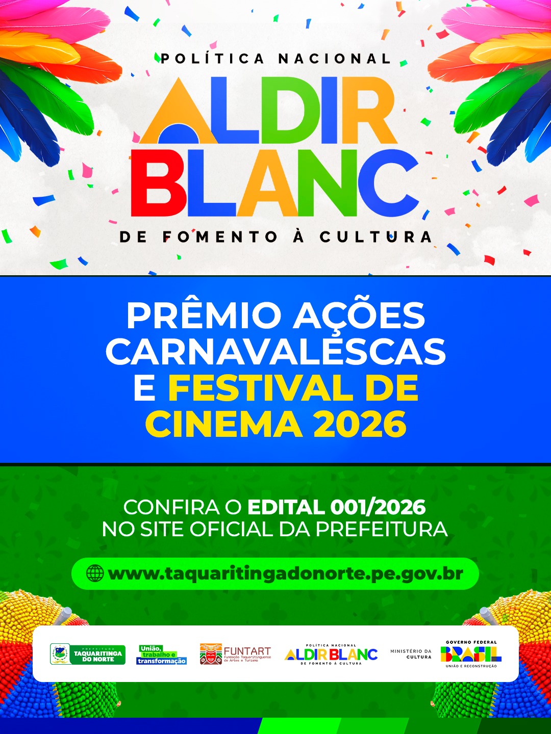 A Prefeitura Municipal de Taquaritinga do Norte, por meio da FUNTART – Fundação Taquaritinguense de Artes e Turismo, lançou nesta terça-feira (28) o Edital de Chamamento Público nº 001/2026, que abre premiação cultural no valor total de R$ 60 mil para reconhecer e incentivar grupos, coletivos, organizações, agremiações carnavalescas e festivais de cinema do município.