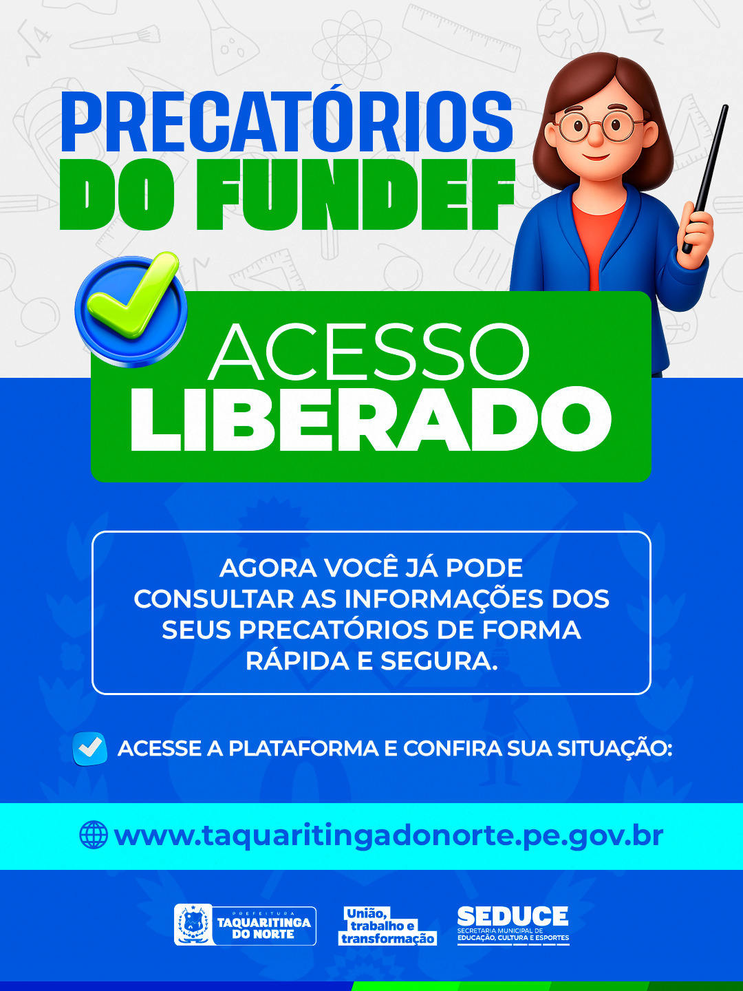 A Prefeitura de Taquaritinga do Norte, por meio da Secretaria de Educação, Cultura e Esportes (SEDUCE), anunciou nesta terça-feira (28) a liberação da plataforma digital destinada ao cadastramento dos beneficiários dos precatórios do Fundo de Manutenção e Desenvolvimento do Ensino Fundamental e de Valorização do Magistério (FUNDEF).